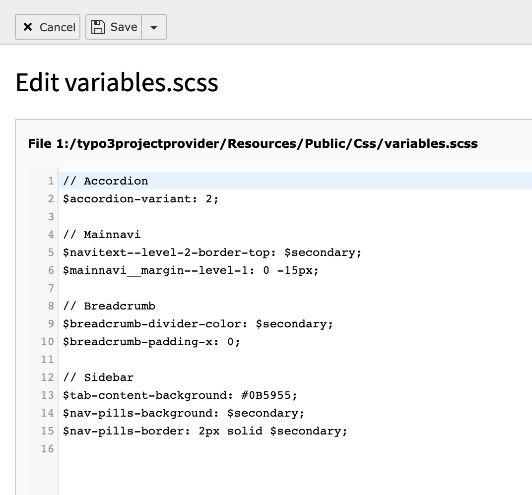 Hier können bestehende Variablen von Bootstrap oder vom TYPO3 Theme (auch die in den Constants) überschrieben werden. Es dürfen keine neuen Variablen in der variables.scss definiert werden, da die Datei nur genutzt werden soll um Bootstrap oder TYPO3 Theme Variablen zu verändern.