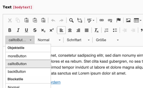 Buttons werden im Texteditor erstellt. Im Auswahlfeld "Stil" kann für einen Link der gewünschte Buttontyp ausgewählt werden. Wichtig! Erst wenn man einen Link hat, kann man dafür einen Buttonstil zuweisen